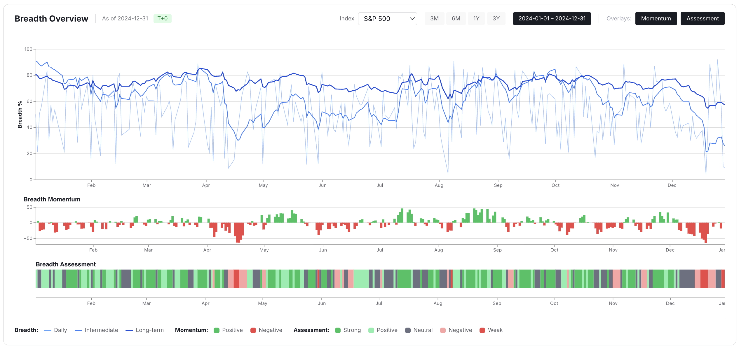 Market breadth measures how many stocks are truly participating across daily, intermediate, and long-term horizons. Deterioration here often precedes regime and momentum breakdowns.